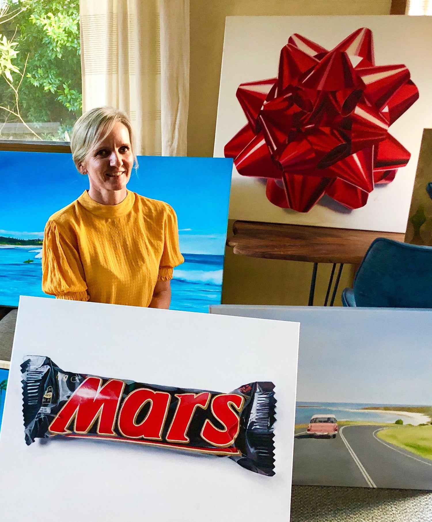 Leonie resides on Bundjalung Country in Northern New South Wales with her husband and two daughters. Her artwork leans towards pop realism, often infused with a quirky flair. Whether depicting nostalgic lollies, classic television shows, or local architectural gems, Leonie captures subjects that evoke fond memories and feelings. She strives to highlight the lighthearted side of life, creating bold and fun pieces that bring humor and nostalgia into people’s homes.