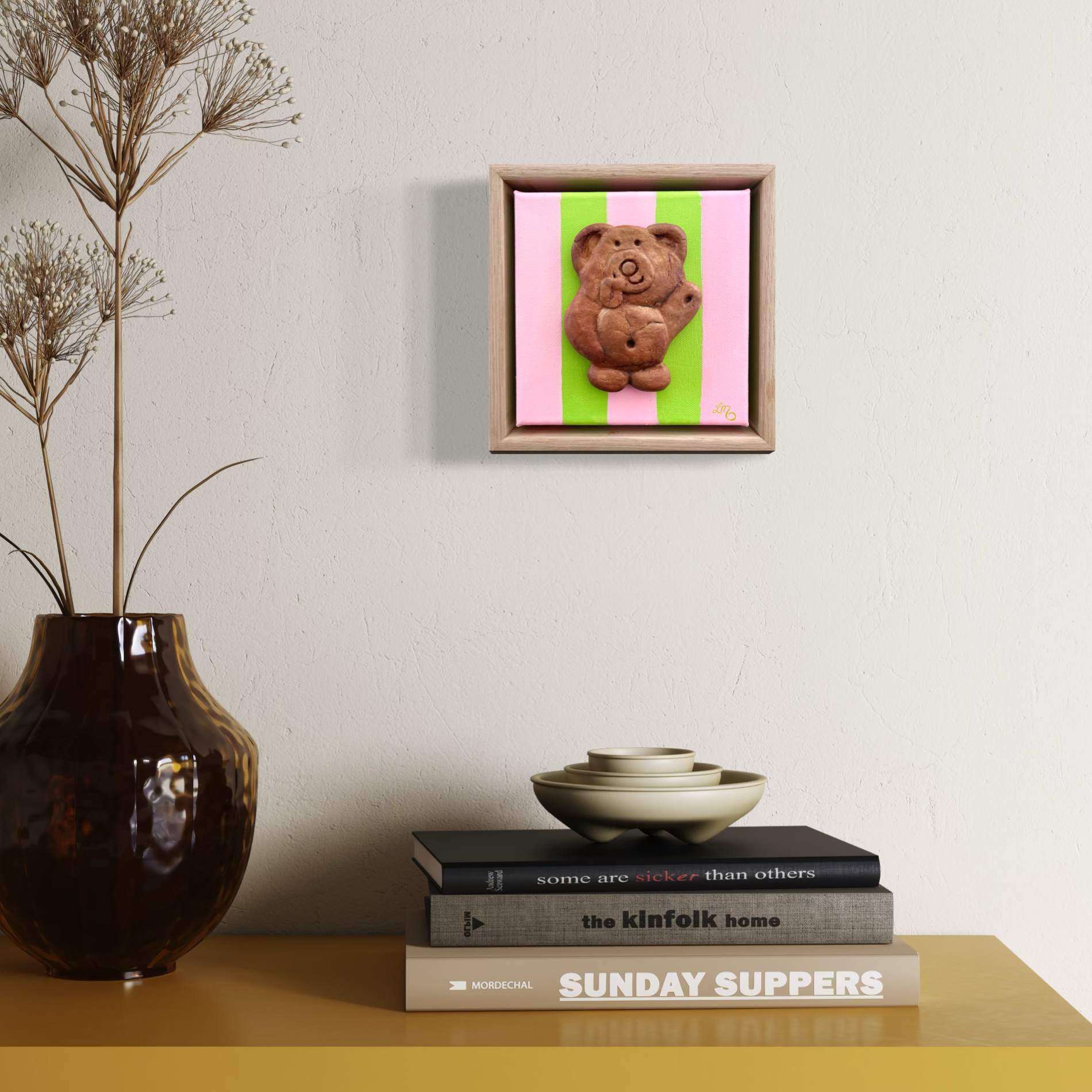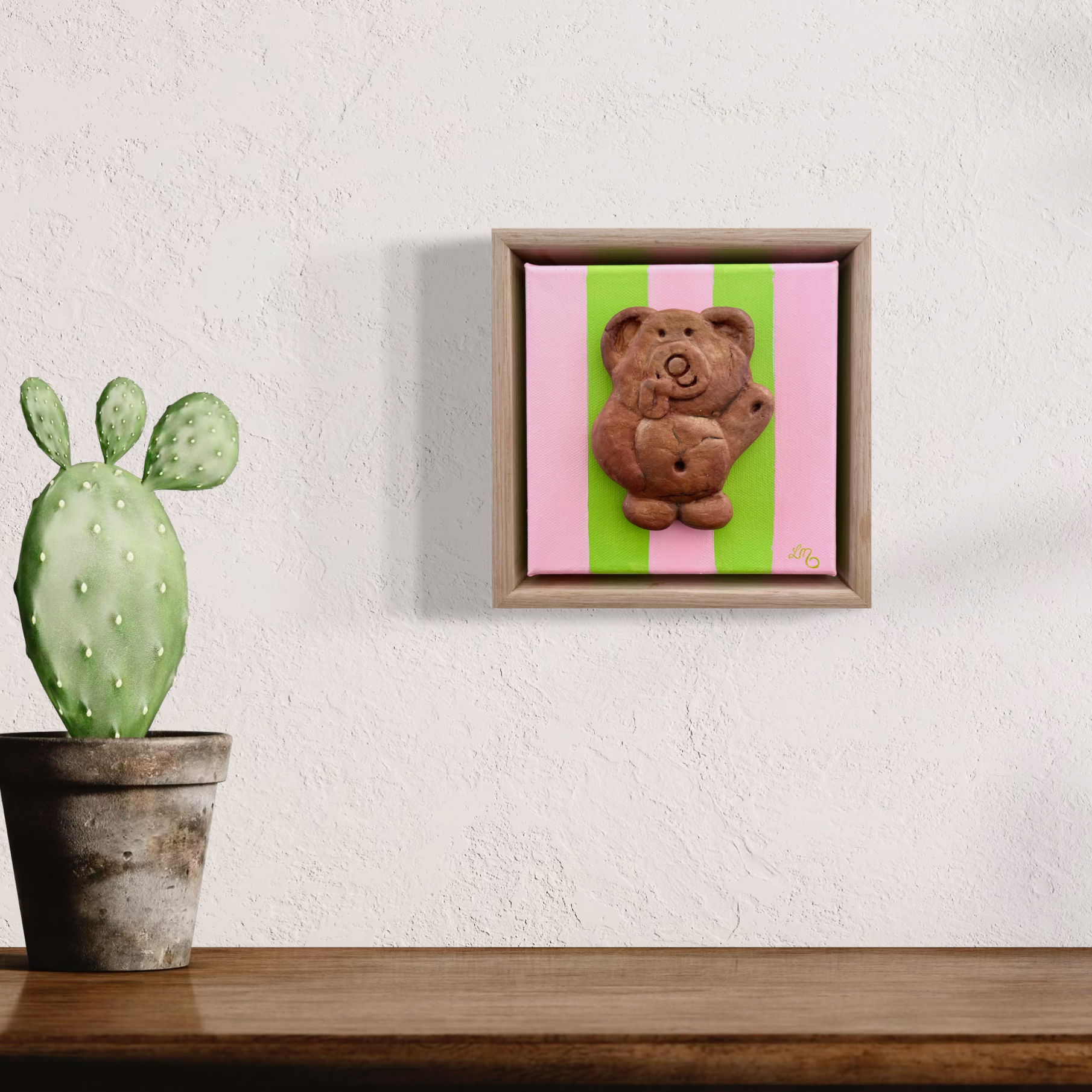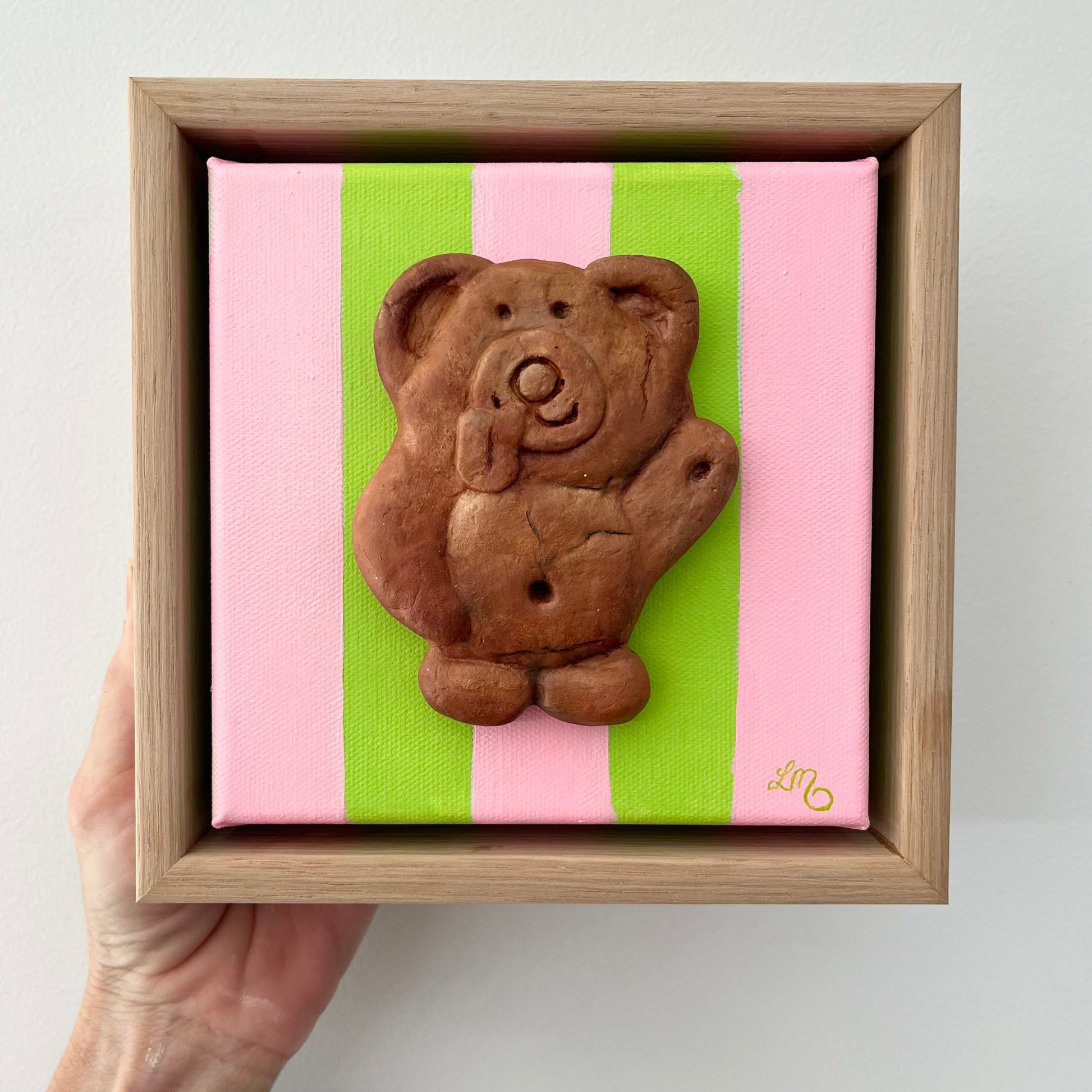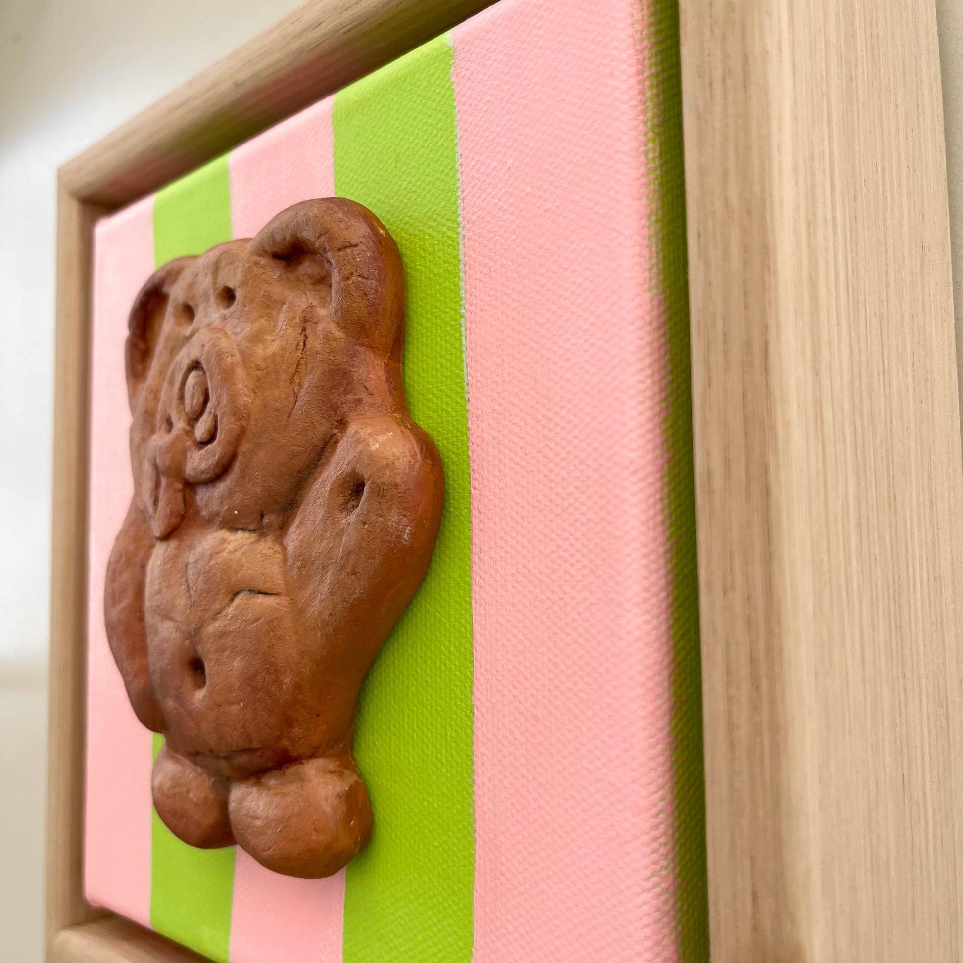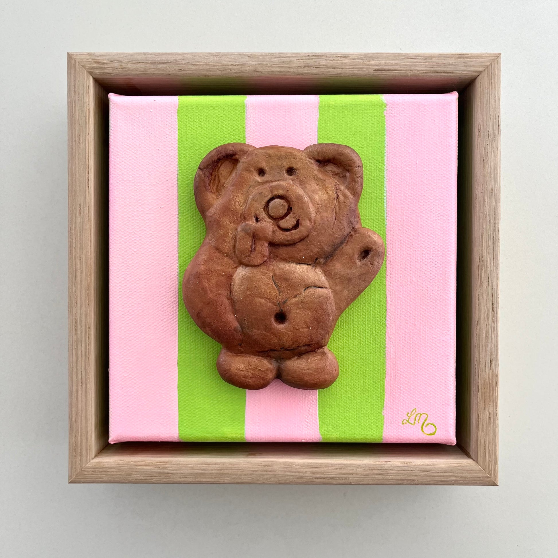 18 x 18cm polymer clay and oil on canvas, framed.